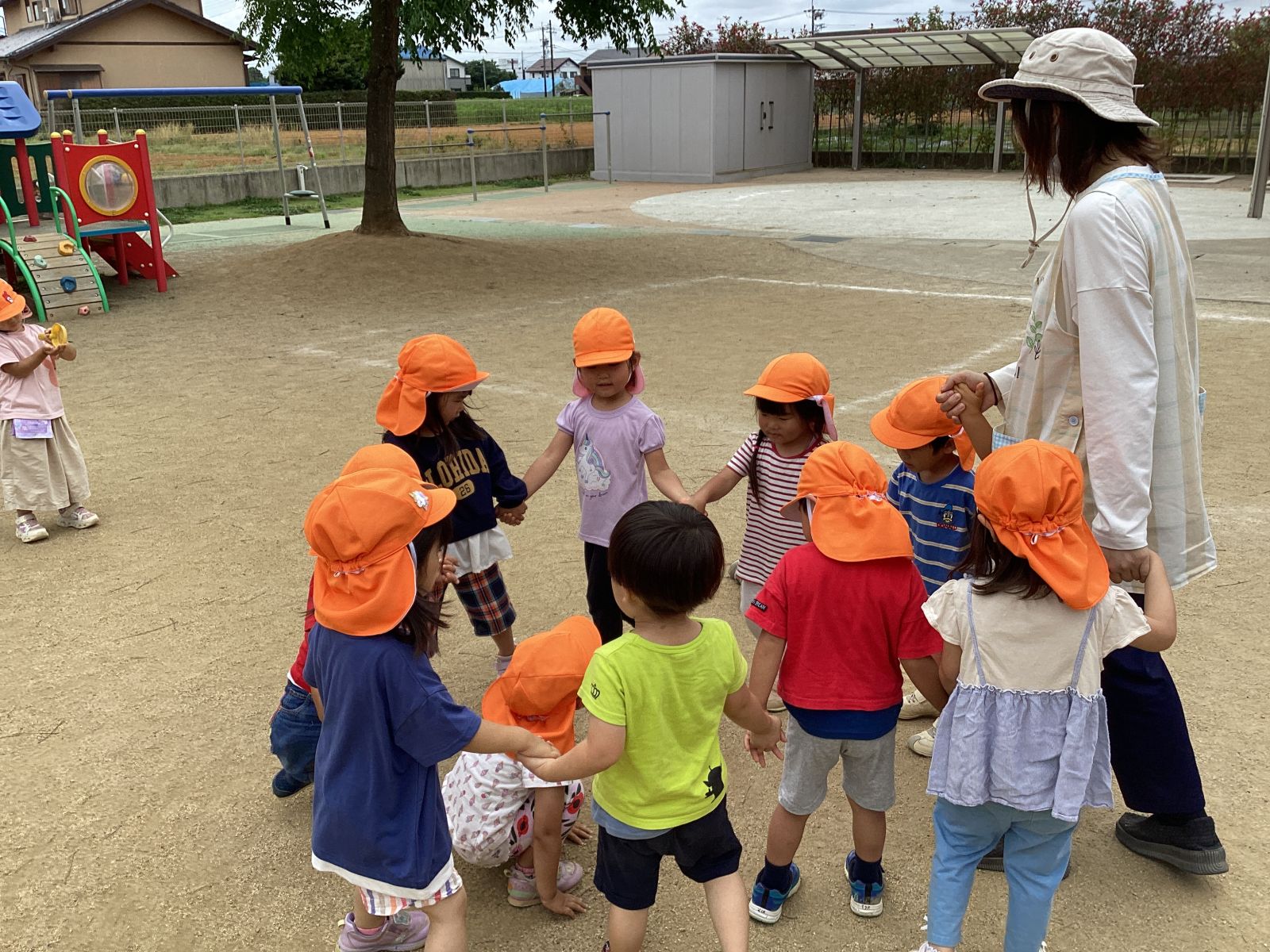 【むっくりくまさん】の集団遊びが上手にできるようになり、少しずつ【みんなで遊ぶ楽しさ】が、味わえるようになってきたみかん組さん。新しく【かごめかごめ】の遊びにチャレンジしました。手を繋ぎながら歌を口ずさみ、後ろのお友達が「わんわん」と声のヒントを出すと「誰かな?〇〇ちゃん?」と考えていました。またみんなで楽しみたいと思います。
